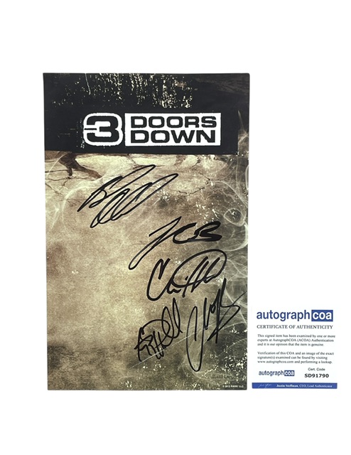 For your consideration is the 3 Doors Down Autographed 7” x 11” Promo Photo, Hand Signed by all five members: Brad Arnold, Chet Roberts, Chris Henderson, Greg Upchurch, and Justin Biltonen.
