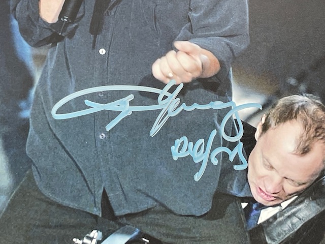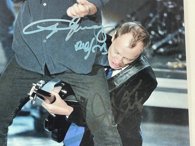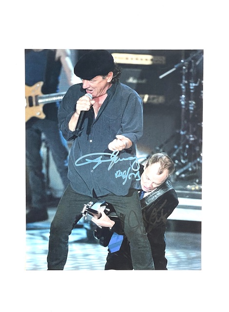 This live AC/DC tour image showcases both band icons in action. Dual-signed examples of Angus Young and Brian Johnson together on one photo are increasingly scarce and highly desirable.