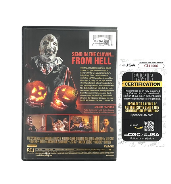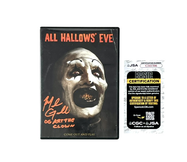For your consideration is the All Hallows’ Eve DVD, hand-signed by Mike Giannelli, the original actor behind Art the Clown. The signature is on the paper insert, not on the plastic cover — the preferred method for collectors.