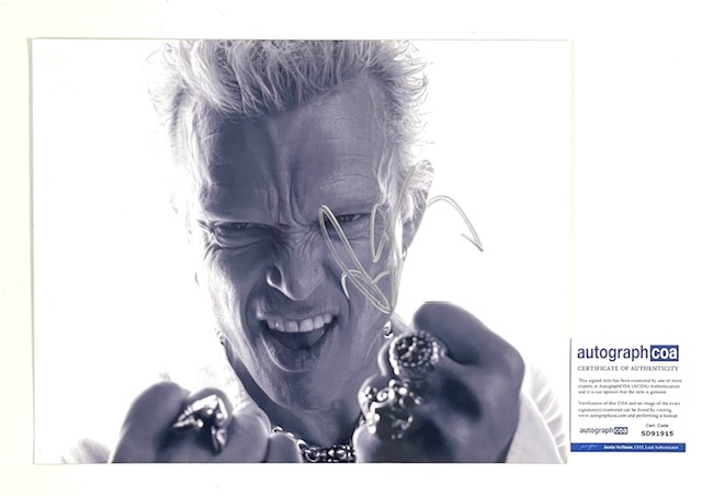 Billy Idol’s signature comes certified authentic by Autograph COA (ACOA). The certification sticker is affixed to the photo, and the matching ACOA Certificate of Authenticity card is included. The signature is fully verifiable in the AutographCOA database, which features a photo of the exact signed item.