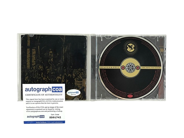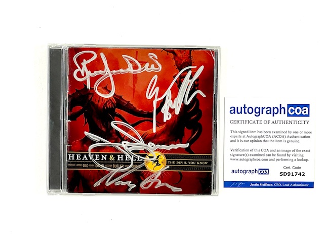 For your consideration is the Heaven and Hell Autographed “The Devil You Know” CD, Hand Signed by all four members of the band: Ronnie James Dio, Tony Iommi, Geezer Butler, and Vinny Appice. All four signed the booklet in beautiful silver paint, with clean, highly legible signatures.