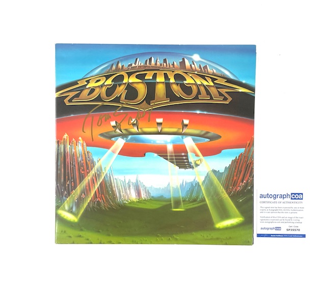 Tom Scholz’s signature comes certified authentic by Autograph COA (ACOA). The certification sticker is affixed to the album cover, and the matching ACOA Certificate of Authenticity card is included. The signature is fully verifiable in the AutographCOA database, which features a photo of the exact signed item.