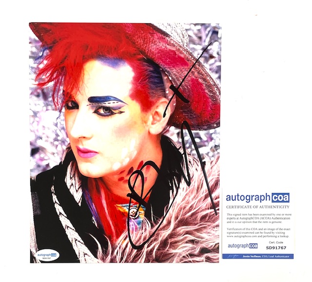 Boy George’s signature comes certified authentic by Autograph COA (ACOA). The certification sticker is affixed to the photo, and the matching ACOA Certificate of Authenticity card is included. The signature is fully verifiable in the AutographCOA database, which features a photo of the exact signed item.