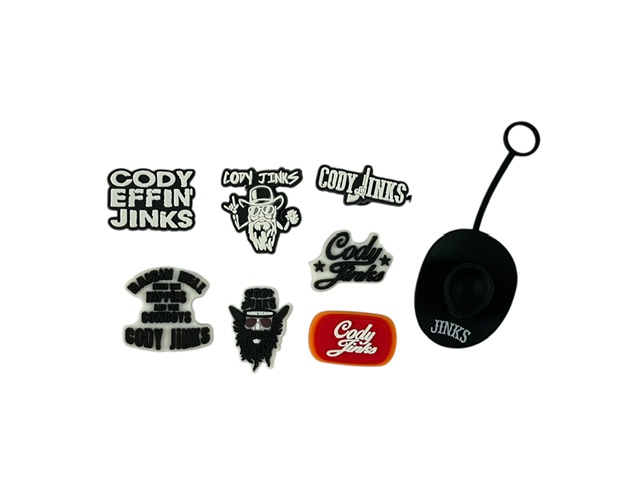 For your consideration is the Cody Jinks Croc Charms Set of 7 plus Topper. This set includes the Gun logo, Raisin’ Hell with the Hippies and the Cowboys logo, Script logo, Oval logo, Heavy Man logo, Beard logo, and Cody Effin’ Jinks logo, along with a bonus topper.