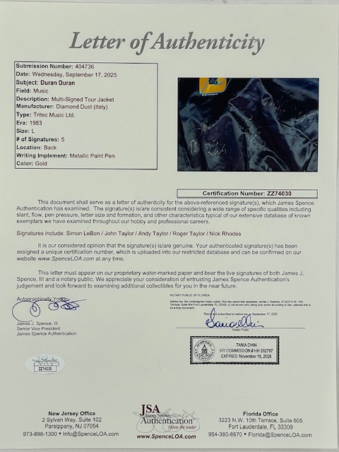 For your consideration is a rare, officially licensed, Duran Duran, Autographed, 1983 Satin Jacket. Hand Signed by all five members: Andy Taylor, Simon Le Bon, John Taylor, Roger Taylor, and Nick Rhodes. This jacket was signed backstage during the band’s 2004 Historic Reunion Tour and features signatures from the band’s complete original lineup—a truly rare collectible, as pieces signed by all five members are next to impossible to attain.