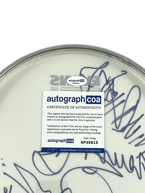 All four signatures come certified authentic by Autograph COA (ACOA). The certification sticker is affixed to the drumhead, and the matching ACOA Certificate of Authenticity card is included. The signatures are fully verifiable in the AutographCOA database, which features a photo of the exact signed item.