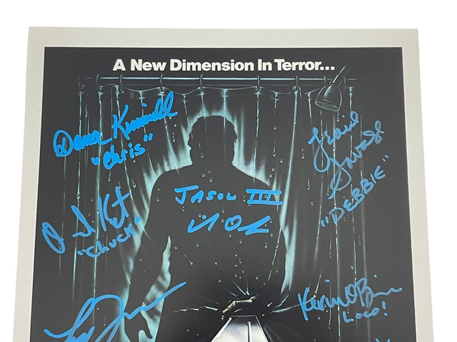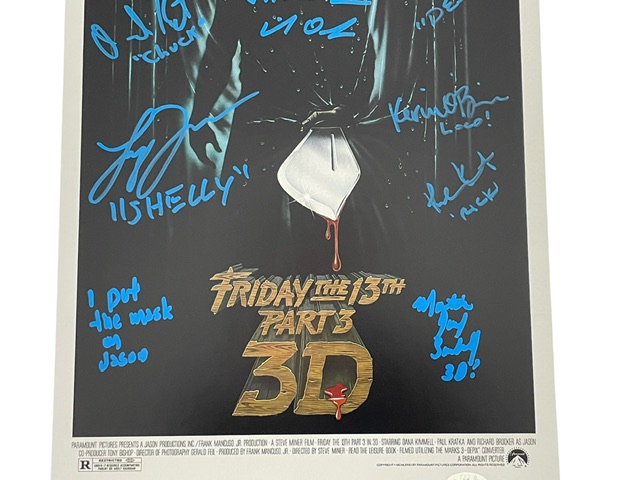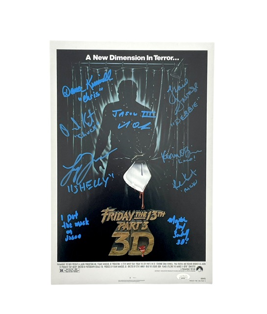 For your consideration is a Friday the 13th Part 3 autographed 12” x 18” movie posterhand-signed by eight cast and crew members from the 1982 film. All signatures were obtained in person and the item comes certified authentic by JSA Authentication Services.