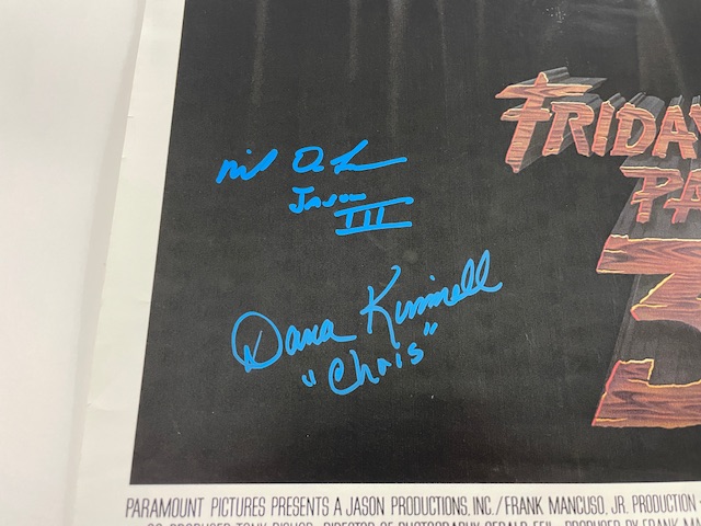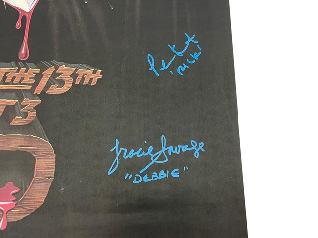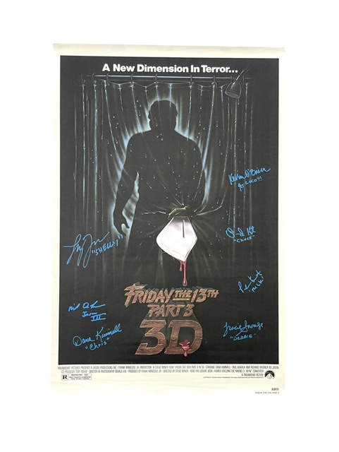 For your consideration is the Friday the 13th Part 3 autographed 27 x 40-inch reproduction movie poster, hand-signed by seven cast members from the 1982 cult classic. All signatures were obtained in person and the poster is certified authentic by JSA Authentication Service.