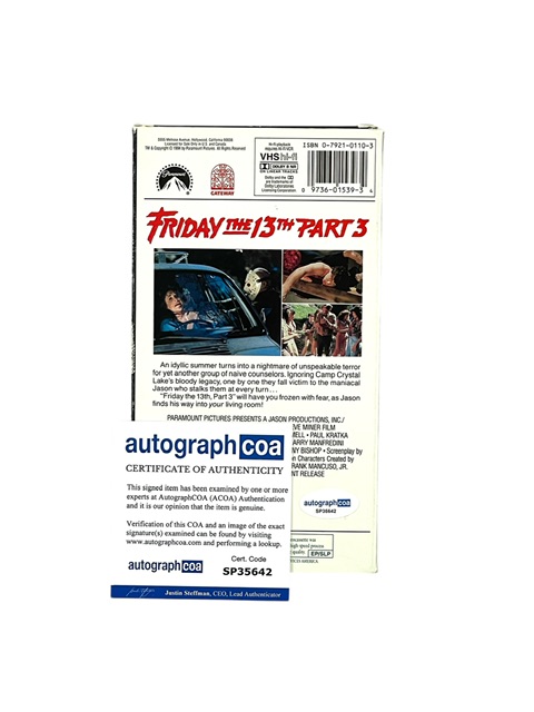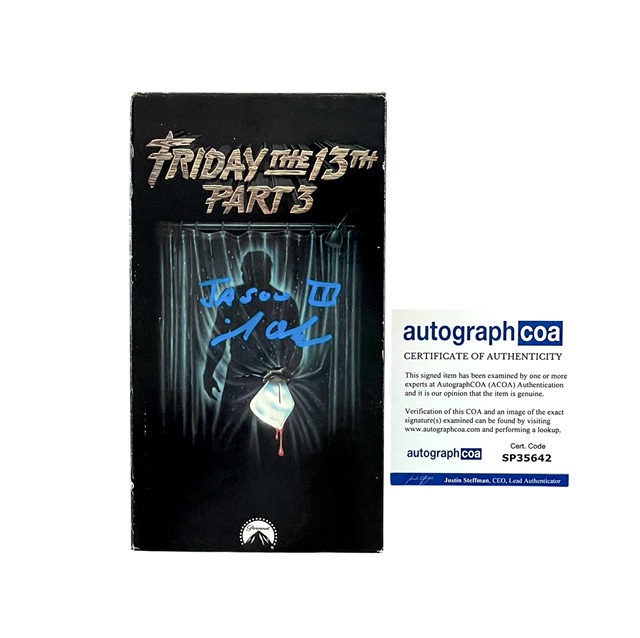 For your consideration is the Friday the 13th Part III Autographed Vintage VHS Tape, Hand Signed by Legendary Stuntman Mike DeLuna, who portrayed Jason Voorhees in select scenes of Friday the 13th Part III, including the infamous rope sequence.