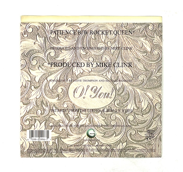 For your consideration is a rare Guns N’ Roses 7-inch Vinyl Record, featuring Patience on the A-side and Rocket Queen on the B-side. Out-of-print original pressing.