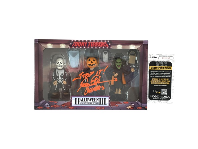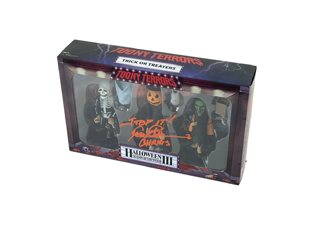 For your consideration is the Halloween III: Season of the Witch Limited Edition NECA Toony Terrors Action Figure Set, hand signed by Legendary Actor Tom Atkins, who portrayed Dr. Dan Challis in the cult-classic 1982 horror film. Tom added his infamous “Stop It!” quote alongside his signature.