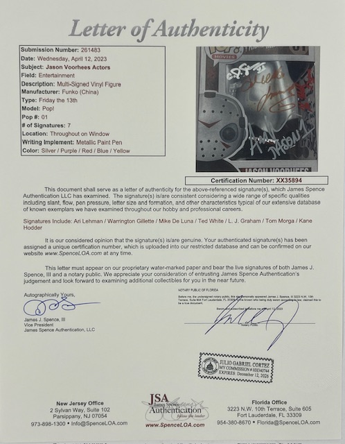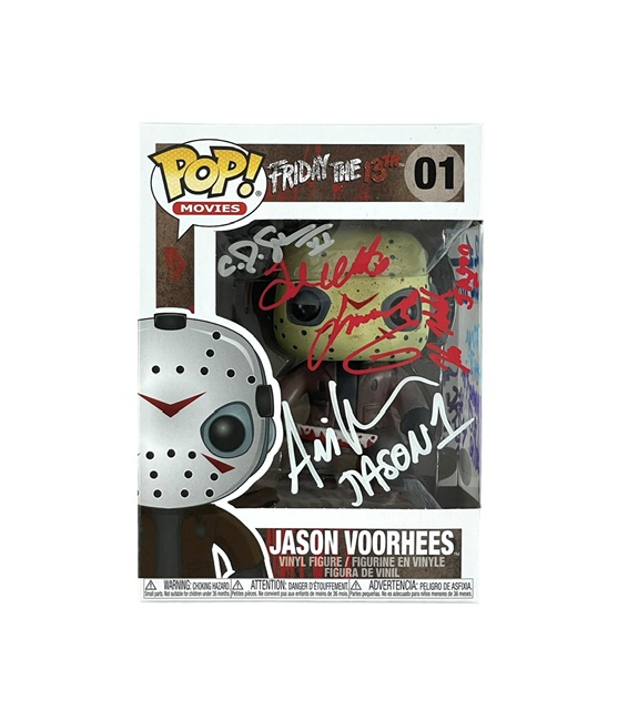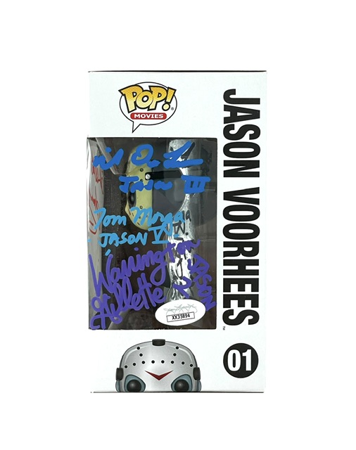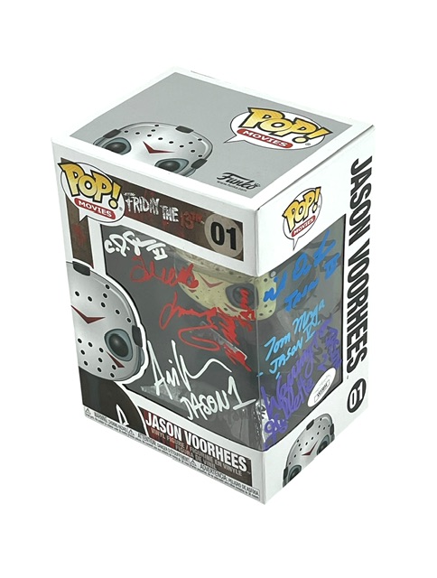For your consideration is the incredibly rare Jason Funko Pop that is Hand Signed by all 7 Jasons from the original classic movies. There are only a few of these in existence that feature at least one Jason from each of the original films. All Signatures were obtained during individual private signings over the past 1.5 years. Comes with a full Letter of Authenticity from JSA Authentication Services. This is an absolute must for the True Horror Collector. Overall condition is good considering the amount of traveling and handling.