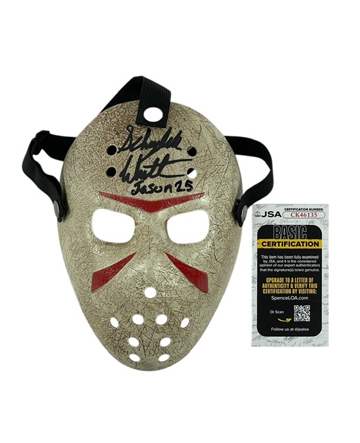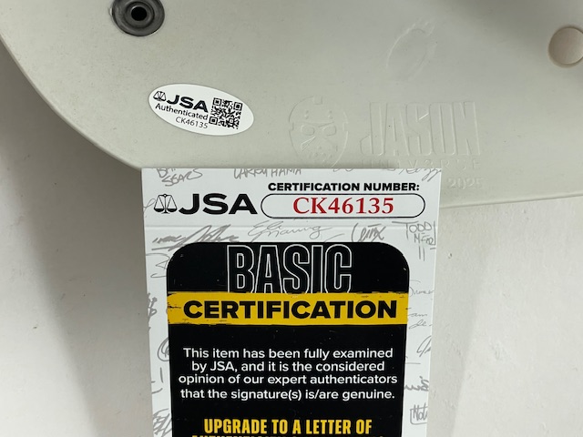 Schuyler White’s signature comes Certified Authentic by JSA. The certification sticker is affixed to the mask, and the matching JSA Certificate of Authenticity card is included. The signature can be verified in the JSA database using the provided certification number.
