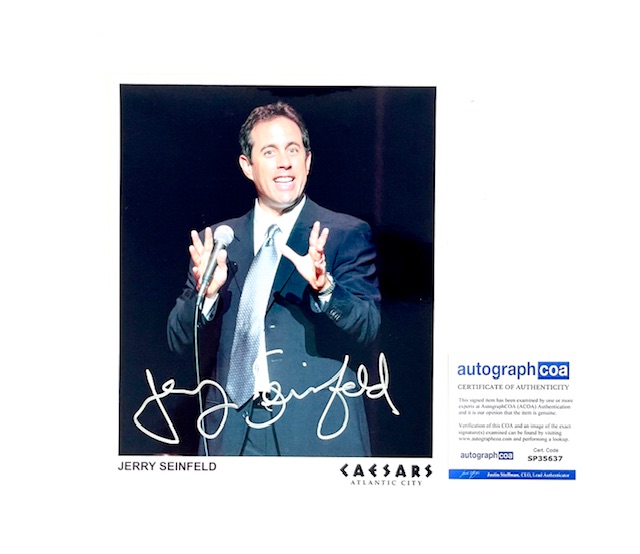 Jerry Seinfeld’s signature comes certified authentic by Autograph COA (ACOA). The certification sticker is affixed to the photo, and the matching ACOA Certificate of Authenticity card is included. The signature is fully verifiable in the AutographCOA database, which features a photo of the exact signed item.