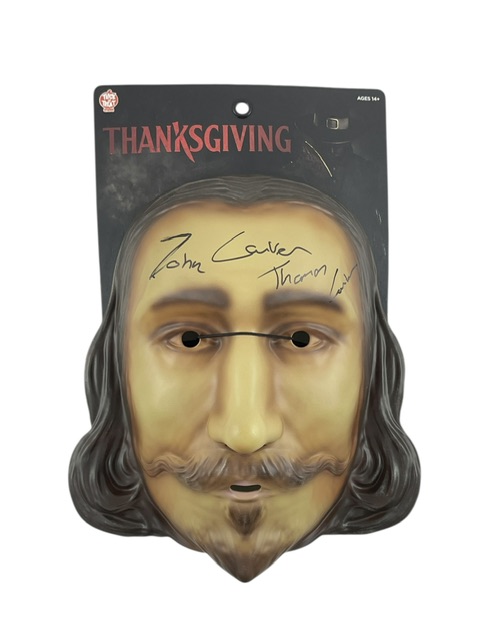 For your consideration is the John Carver Prop Replica Mask from the film Thanksgiving, autographed by Thomas Lorber.