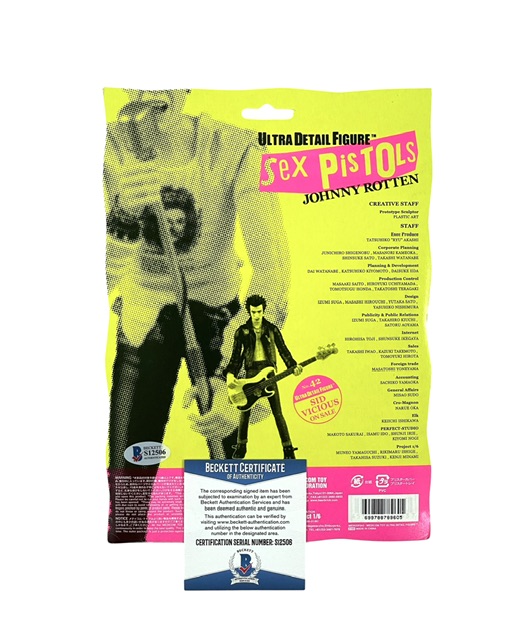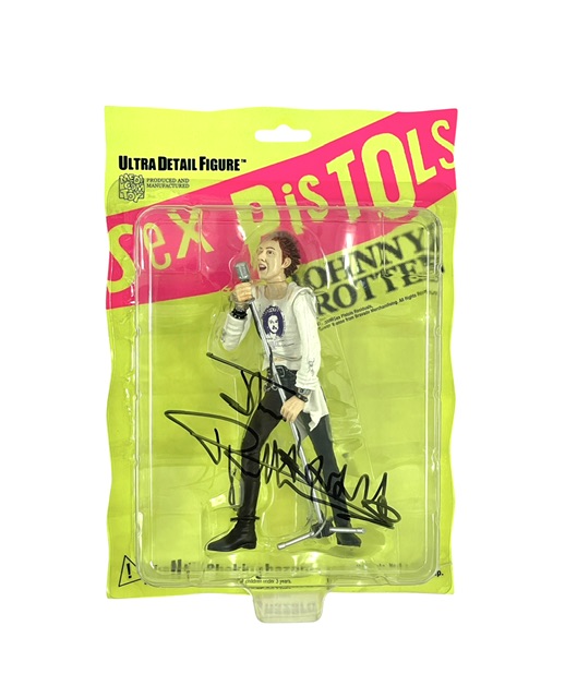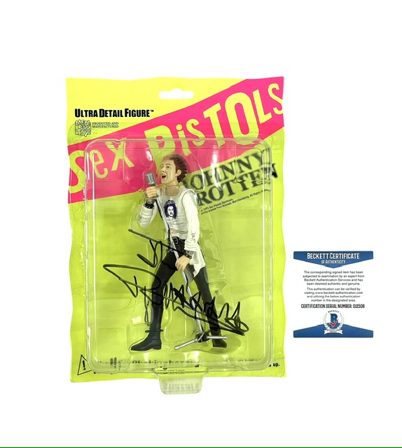 For your consideration is the Johnny Rotten Autographed Limited Edition Medicom Action Figure, depicting John Lydon of the Sex Pistols. This collectible comes sealed and in beautiful condition, with Johnny Rotten’s signature being extremely rare and highly sought after.
