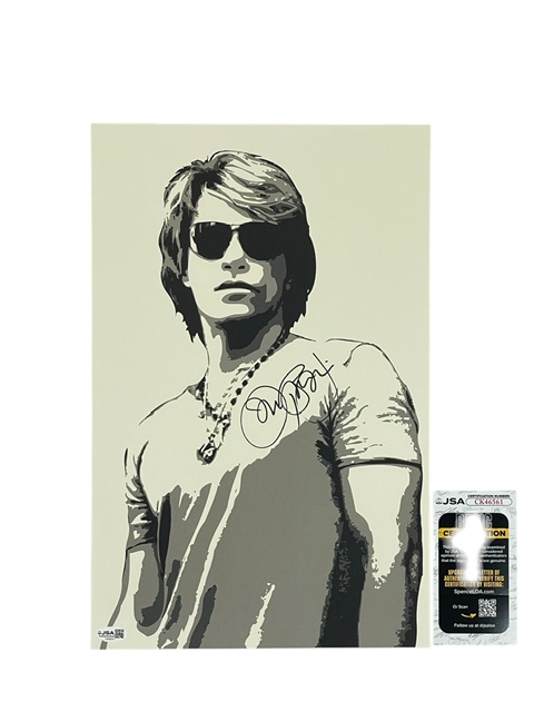 Jon Bon Jovi’s signature comes certified authentic by JSA Authentication Services. The certification sticker is affixed to the poster, and the matching JSA Certificate of Authenticity card is included.