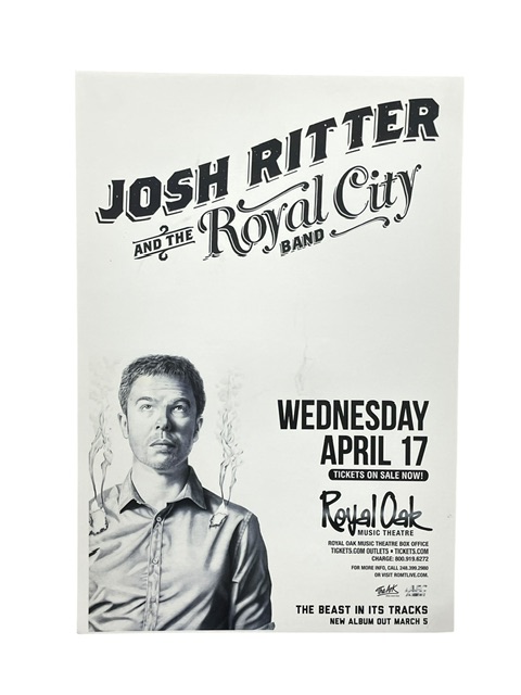 For your consideration is the Josh Ritter 13” x 19” Limited Edition Concert Poster from his April 17, 2013 performance at the Royal Oak Music Theatre in Royal Oak, Michigan. This beautifully designed piece captures the spirit of Ritter’s live show and is an excellent addition for fans and collectors alike. Poster remains in good condition.
