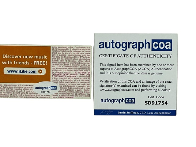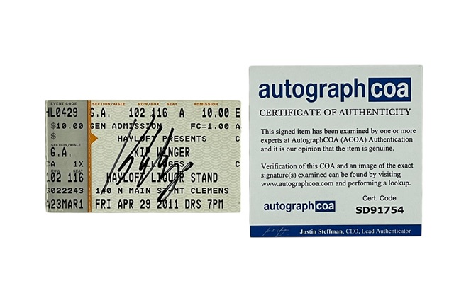 Kip Winger’s signature comes certified authentic by Autograph COA (ACOA). The certification sticker is affixed to the ticket stub, and the matching ACOA Certificate of Authenticity card is included. The signature is fully verifiable in the AutographCOA database, which features a photo of the exact signed item.