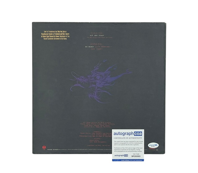 This extremely rare gold-stamped promo 12-inch Album contains the record and features the following tracks — Side 1: “Rip and Tear.” Side 2: “No Mercy” (Live version) and “Rock Candy,” a Montrose cover. The condition is beautiful.