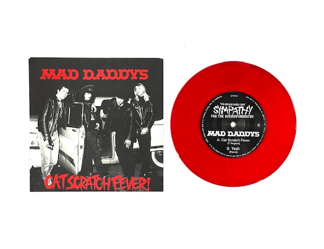 For your consideration is the Mad Daddy Rare Cat Scratch Fever Limited Edition 7-inch Vinyl in red, released in 1990 by Sympathy for the Record Industry. This high-energy cover of the Ted Nugent classic features Slim Chance on bass, Wrongo Starr on drums, Screamin’ Johnson on guitar, and Stinky on vocals.