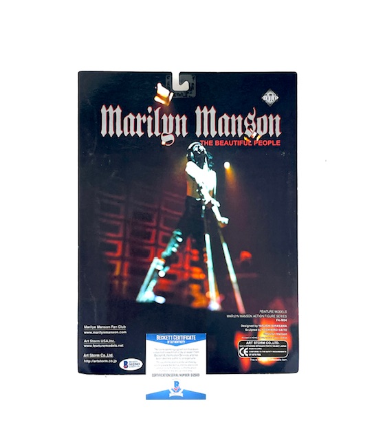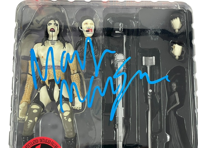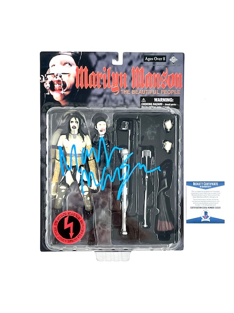 For your consideration is the Marilyn Manson Autographed Fewture Action Figure, Hand Signed by the legendary Marilyn Manson himself in popping blue paint. This is Manson’s full name signature, certified authentic by Beckett Authentication Services. The certification sticker is affixed to the packaging, and the matching Certificate of Authenticity card is included.