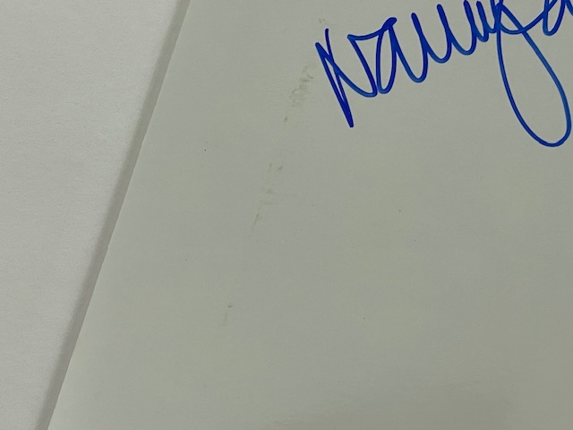 Nancy’s signature comes certified authentic by Beckett Authentication Services. The Beckett certification sticker is affixed to the photo, and the signature is fully verifiable in the Beckett database.