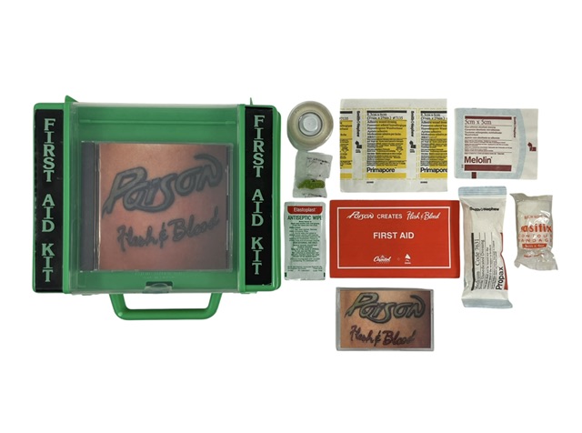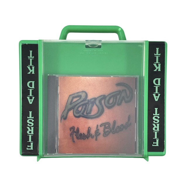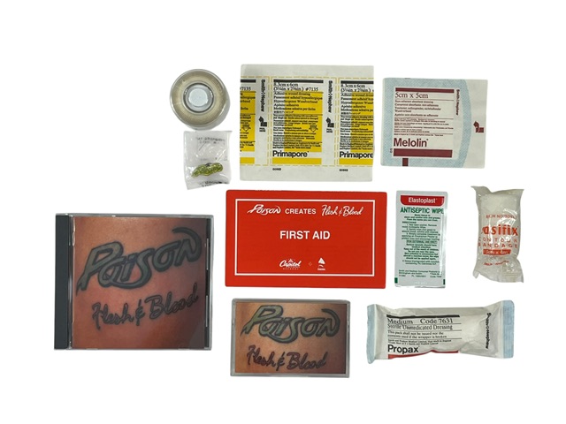 For your consideration is the Poison Promo “Flesh & Blood” First Aid Kit, created by the band’s record label in 1990 to promote the album release. This highly unusual and scarce promotional set was issued in the form of a hard plastic lunchbox-style case designed as a first aid kit, making it one of the most creative Poison promos ever produced.