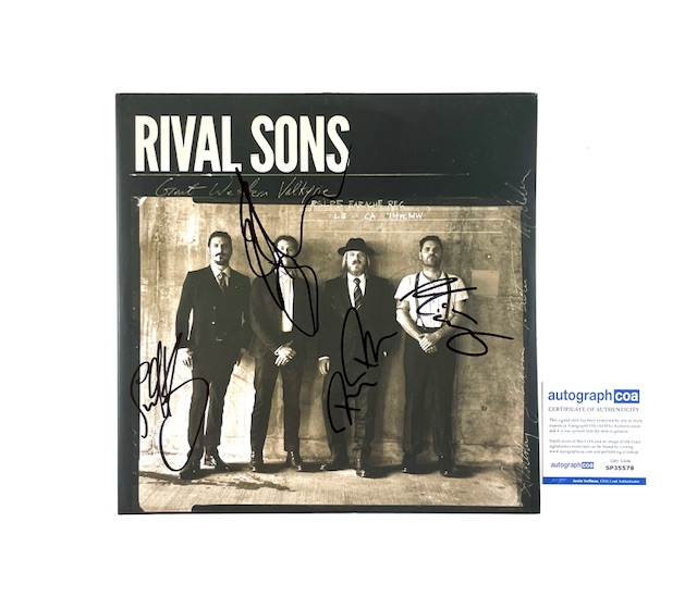 For your consideration is the Rival Sons Autographed “Great Western Valkyrie” Vinyl Album, hand signed by vocalist Jay Buchanan, guitarist Scott Holiday, bassist Dave Beste, and drummer Michael Miley. The cover has been beautifully signed by the full band, making this a complete and highly desirable example.