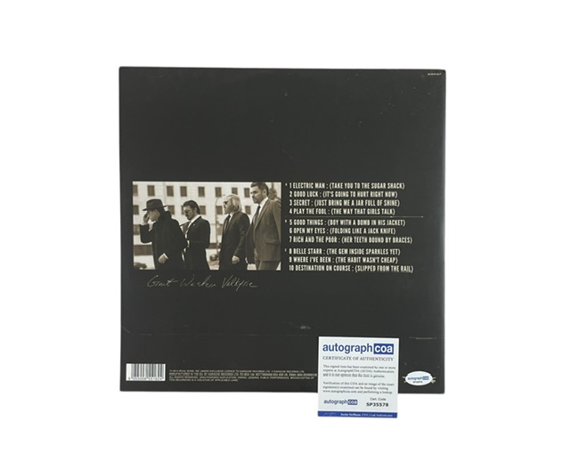 All four signatures come certified authentic by Autograph COA (ACOA). The certification sticker is affixed to the back of the Vinyl cover, and the matching ACOA Certificate of Authenticity card is included. The signatures are fully verifiable in the AutographCOA database, which features a photo of the exact signed item.