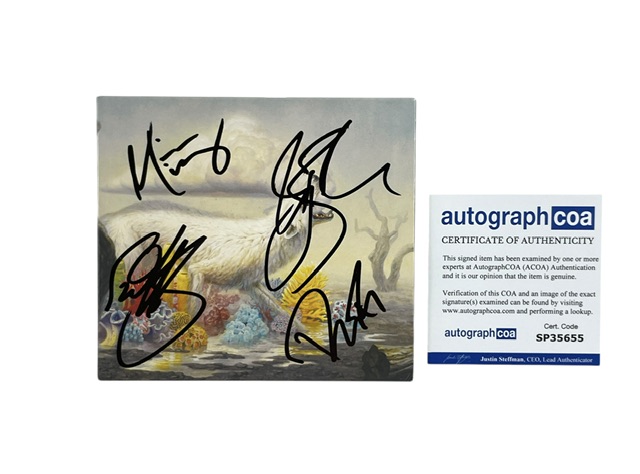 All four signatures come certified authentic by Autograph COA (ACOA). The certification sticker is affixed to the back of the CD booklet, and the matching ACOA Certificate of Authenticity card is included. The signatures are fully verifiable in the AutographCOA database, which features a photo of the exact signed item.