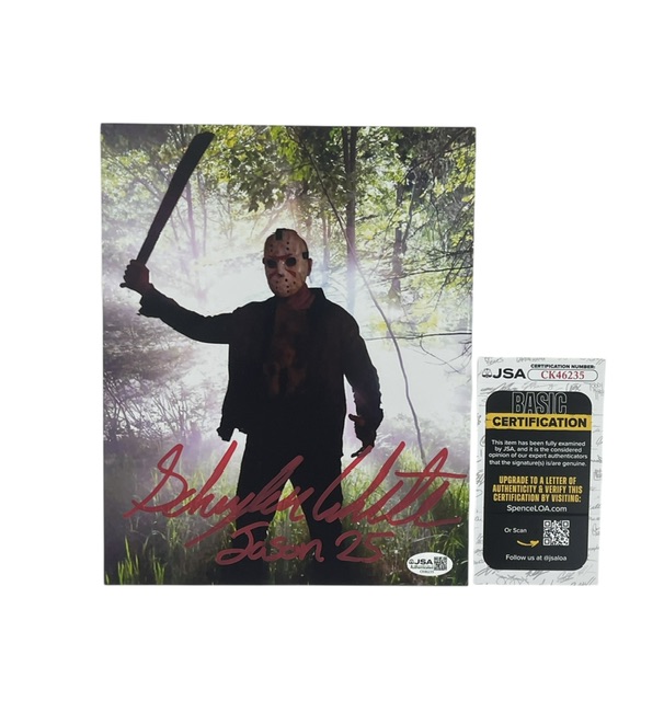For your consideration is the Schuyler White Autographed 8” x 10” Photo that was Hand Signed the first actor to portray Jason Voorhees in the franchise since 2009. After years of litigation, the Friday the 13th universe is finally back, and Schuyler made his debut in the short film Sweet Revenge, reintroducing Jason to a new generation of horror fans. Schuyler is set to portray Jason once again in the long-awaited upcoming Friday the 13th movie.