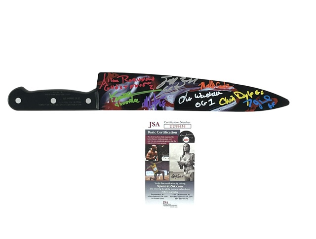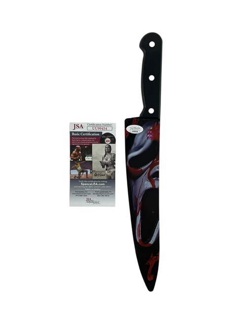 This Officially Licensed Prop Replica plastic knife has been hand signed by eight performers who portrayed Ghostface across the iconic Scream franchise. The bold presentation of the signatures adds strong visual appeal to this classic slasher prop replica.