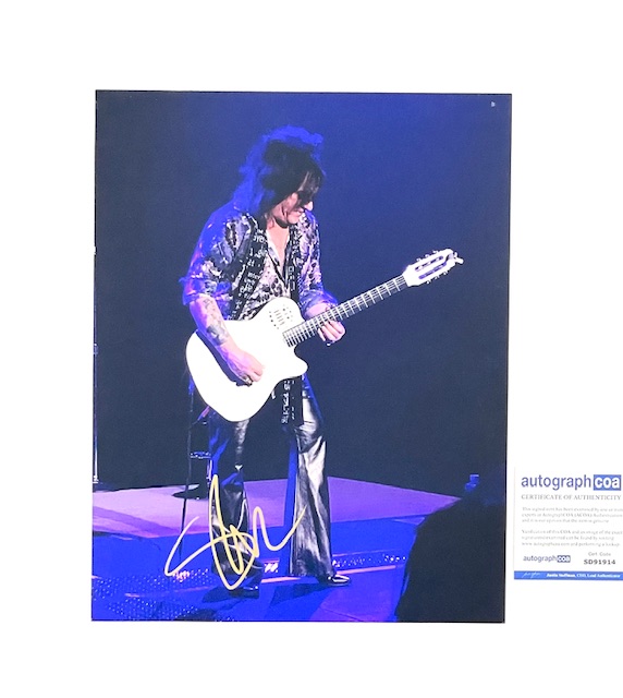 Steve Stevens’ signature comes certified authentic by Autograph COA (ACOA). The certification sticker is affixed to the photo, and the matching ACOA Certificate of Authenticity card is included. The signature is fully verifiable in the AutographCOA database, which features a photo of the exact signed item.