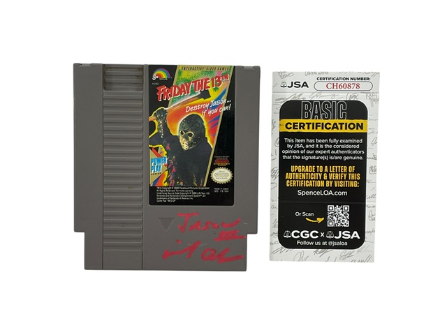 For your consideration is the Friday the 13th Autographed Nintendo Game Cartridge, Hand Signed by Legendary Stuntman Mike DeLuna, who portrayed Jason Voorhees in select scenes of Friday the 13th Part III, including the infamous rope sequence.