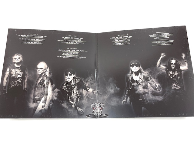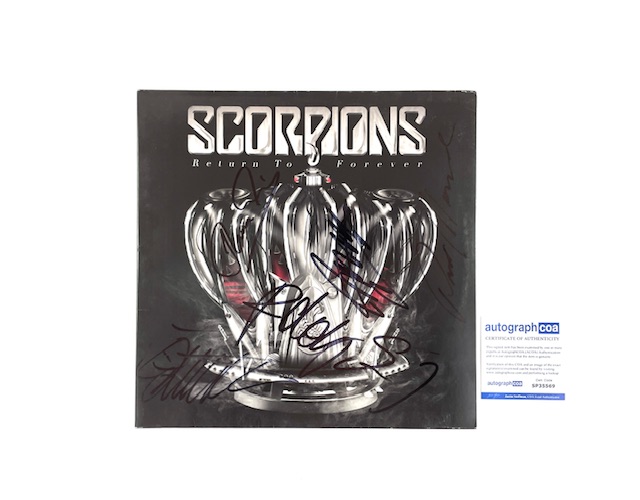 Klaus Meine, Rudolf Schenker, Matthias Jabs, Paweł Mąciwoda, and James Kottak’s signatures come certified authentic by Autograph COA (ACOA). The certification sticker is affixed to the sleeve, and the matching ACOA Certificate of Authenticity card is included. The signatures are fully verifiable in the AutographCOA database, which features a photo of the exact signed item.