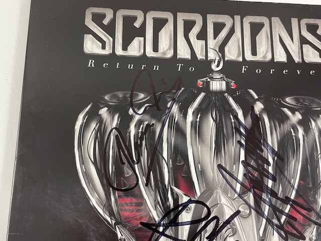 For your consideration is the The Scorpions Autographed Limited Edition “Return to Forever” Double Vinyl Album, Hand Signed by all five members of the lineup featured on the album: Legendary vocalist Klaus Meine, guitarists Rudolf Schenker and Matthias Jabs, bassist Paweł Mąciwoda, and drummer James Kottak. An Extremely rare completed band-signed piece, this is the kind of Scorpions collectible that is seldom encountered in the marketplace.
