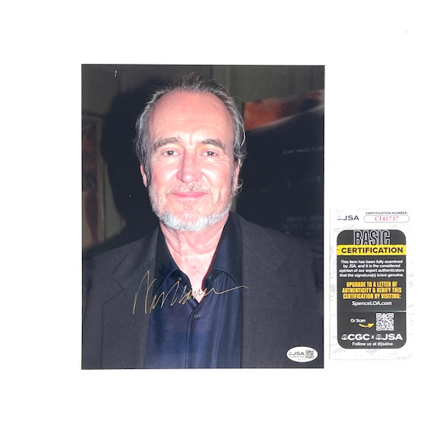Wes Craven’s signature comes certified authentic by James Spence Authentication (JSA). The certification sticker is affixed to the photo, and the matching JSA Certificate of Authenticity card is included.