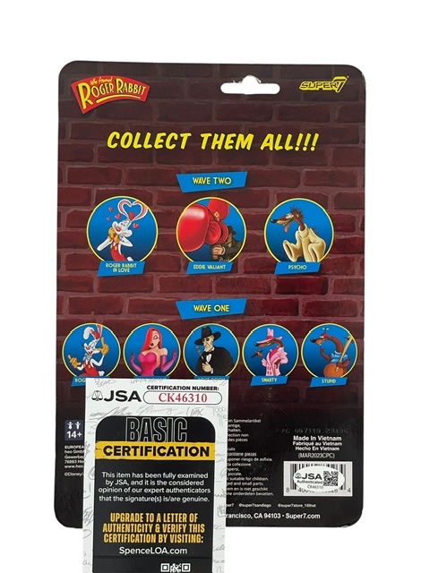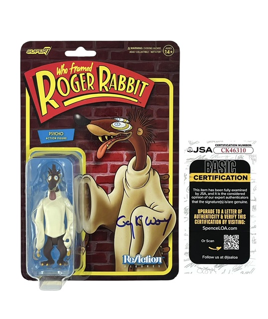 This Super7 Psycho Action Figure is signed directly on the card by Gary K. Wolf, the creator of the Who Framed Roger Rabbit franchise. The autograph was obtained during a private signing and adds strong collector appeal to this officially licensed Super7 release. The figure remains in great condition and displays very well.