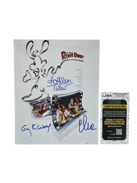 This is an extremely rare combo piece, with very few examples featuring Kathleen Turner, Gary K. Wolf, and Charles Fleischer on the same item. A significant and visually striking display piece that bridges the original literary work and the iconic film adaptation.